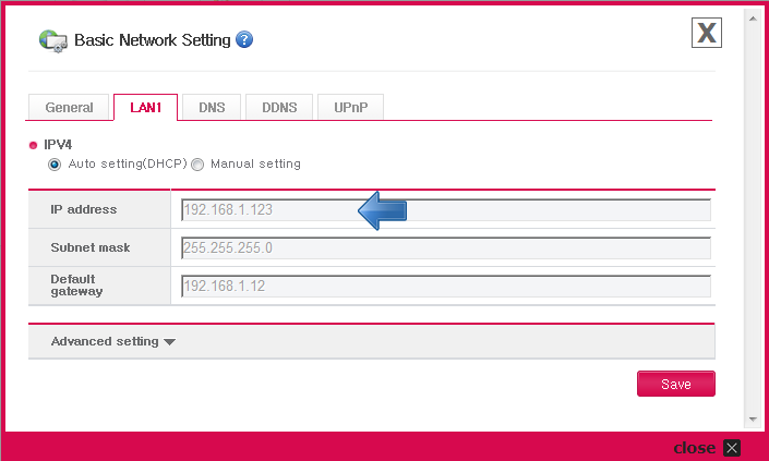 Now you need to find the IP address of your LG web server.To do this, click on Basic network setting under Network Service Setting on the LG Web Configuration menu.On the Basic Network Setting screen, click LAN1.This will show you the IP address of your web server.Write this address down, because you will need it later.Click close to exit the Basic Network Setting menu.