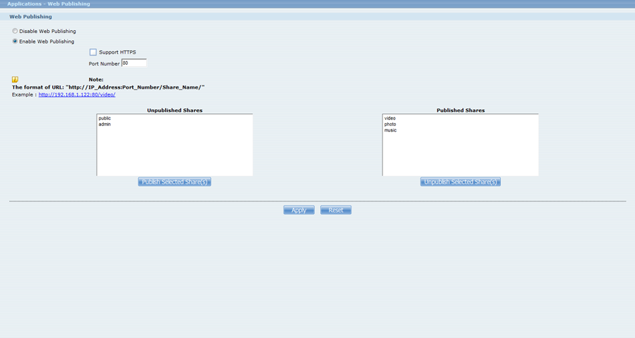 Once your ZyXEL NAS is set up on your network, you need to enable the built in web server.To do this, open the ZyXEL NAS Admin Web Menu.On the menu on the left side of the screen, select Web Publishing.Under Web Publishing, click the circle to the left of Enable Web Publishing to turn on the web server. In the window under Unpublished Shares, select video, photo, and music, and then click Publish Selected Share(s). The items you selected should move over to the Published Shares window. Click Apply to save your changes and start the web server.